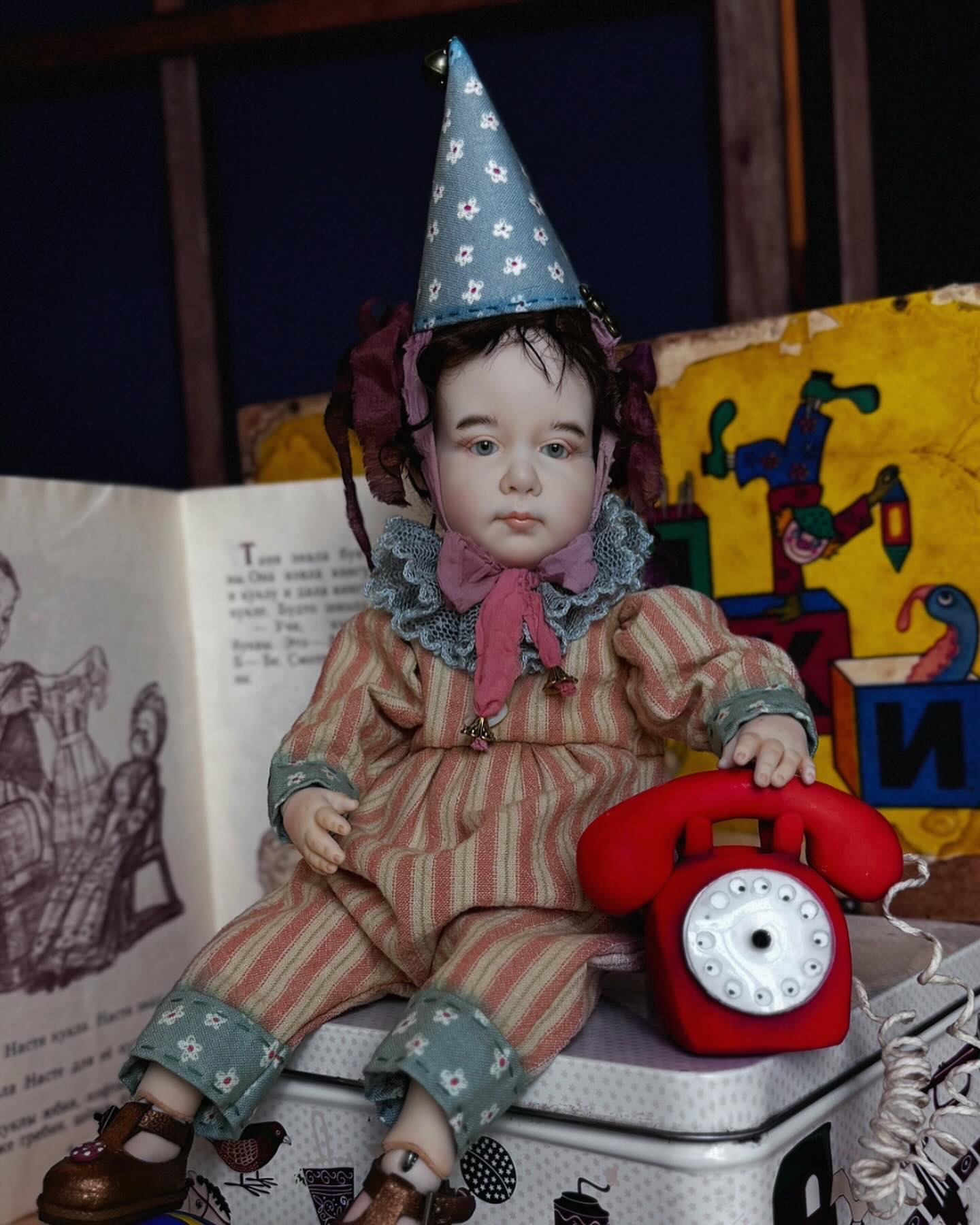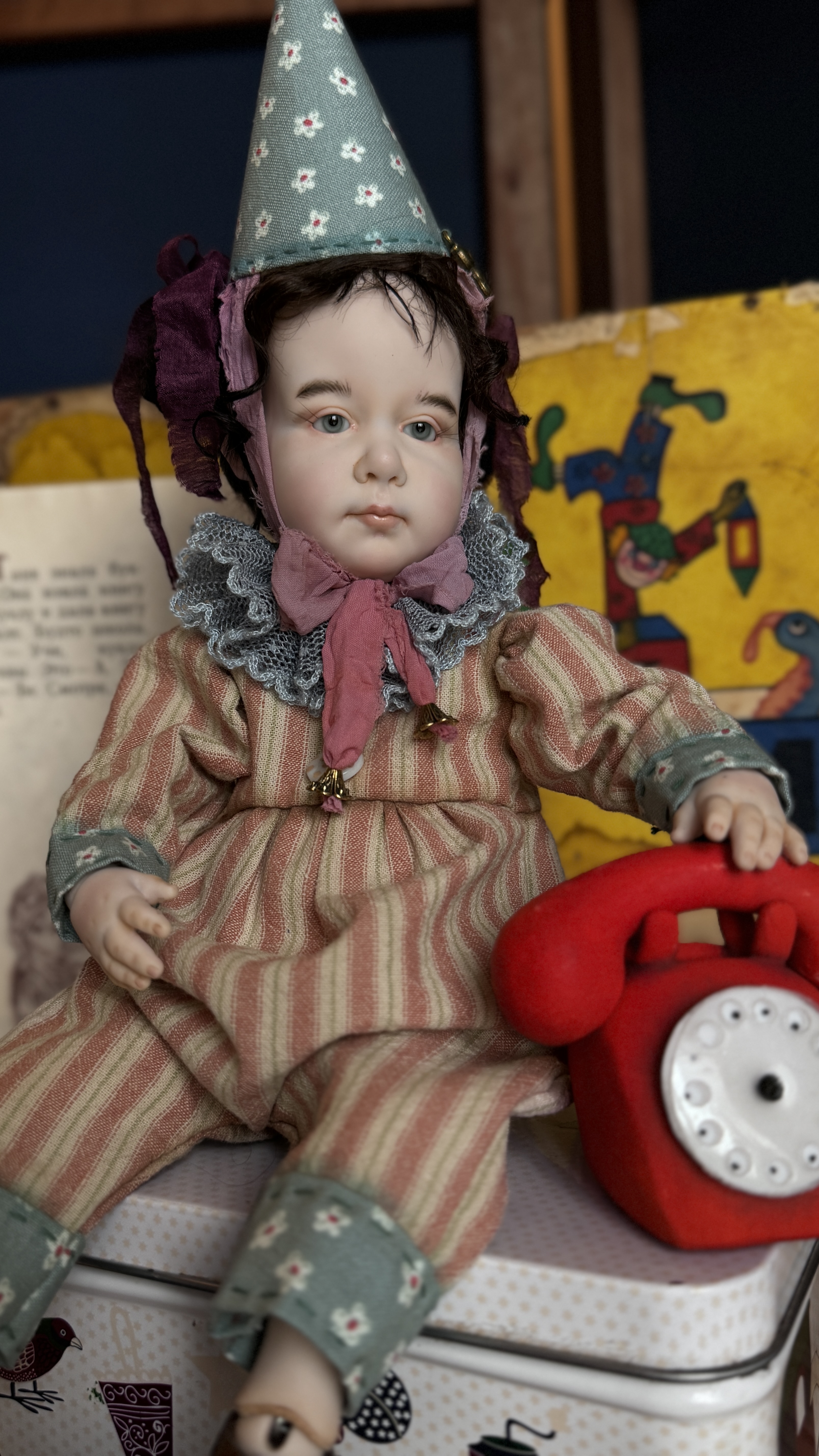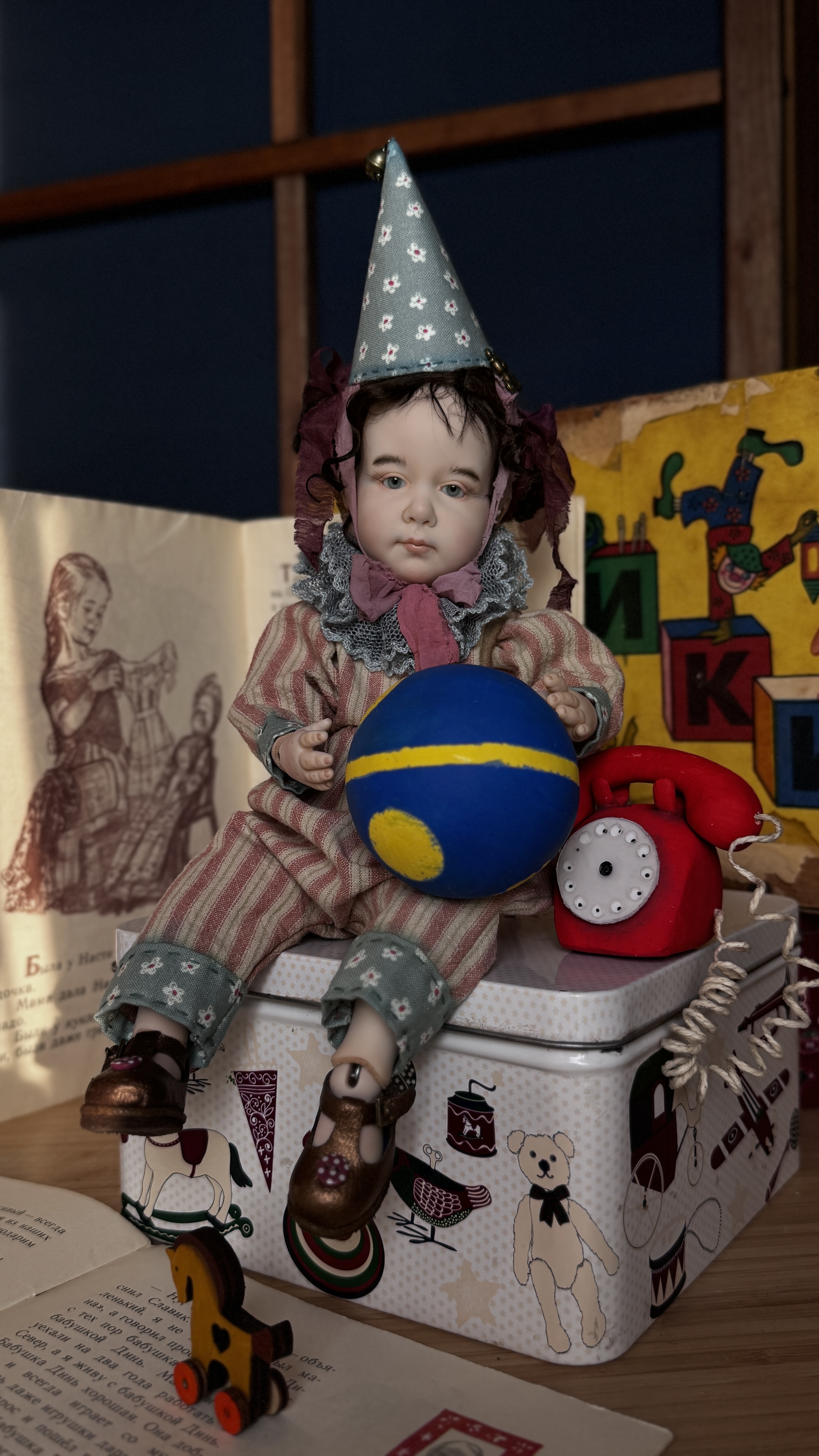Кукла полностью подвижна, выполнена из фарфора, собрана на пружины.
