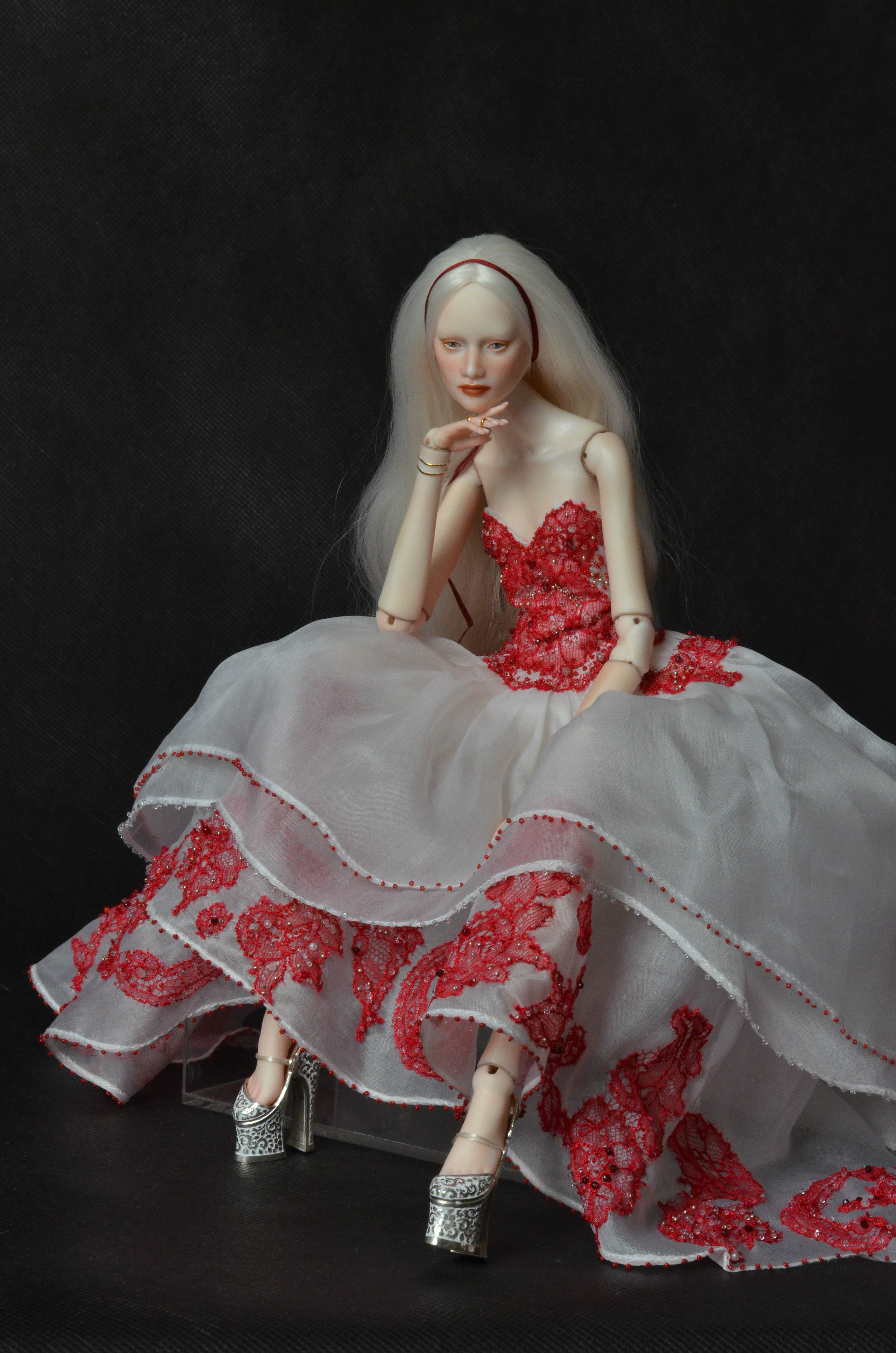 Кукла выполнена из фарфора, высота 34 см. Расписана надглазурными красками, покрыта металликами, которые придают поверхности мерцание. Кольца и браслеты на руках, с применением настоящего золота. Кукла собрана на пружины, шарниры проклеены кожей. Аутфит выполнен из органзы, хлопкового кружева. Платье расшито, винтажным микро бисером и натуральными камнями. Туфли из серебра, покрыты эмалью. Парик из мохера, съемный на магните.
